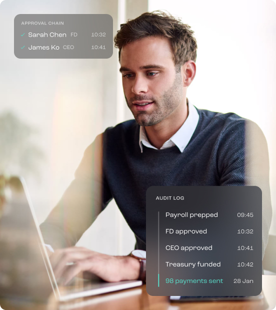 Every month it's the same stress. Chase approvals, move money, double-check the spreadsheet, pray nothing went wrong. Round turns all of that into a single notification: payroll complete.